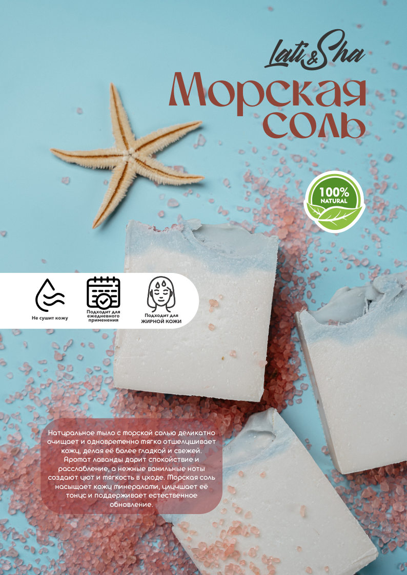 Натуральное мыло с морской солью деликатно очищает и одновременно мягко отшелушивает кожу, делая её более гладкой и свежей.